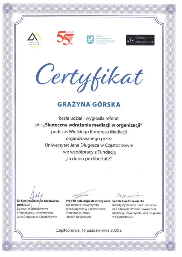 - autorka licznych artykułów i publikacji dotyczących mediacji.