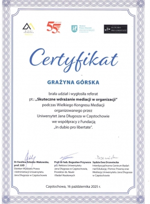 - uczestniczka krajowych i międzynarodowych konferencji poświęconych Alternatywnym metodom rozwiązywania sporów,