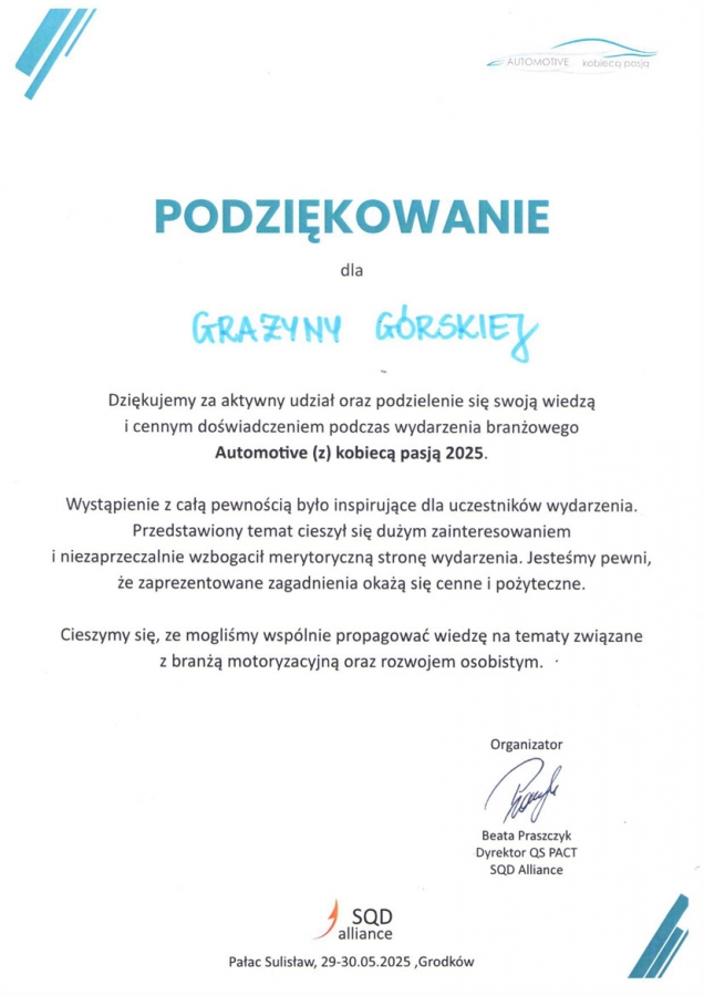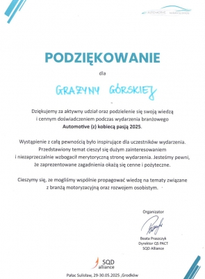 Droga Grażyno, dziękuję za szkolenie. Było bardzo wartościowe- merytoryczne- zarówno jeśli chodzi o teorię, jak i praktykę. Niezwykle cenna było możliwość obejrzenia doświadczonego mediatora w działaniu. Ważna była również wspaniała atmosfera, przyjazne miejsce i smaczne pr ...